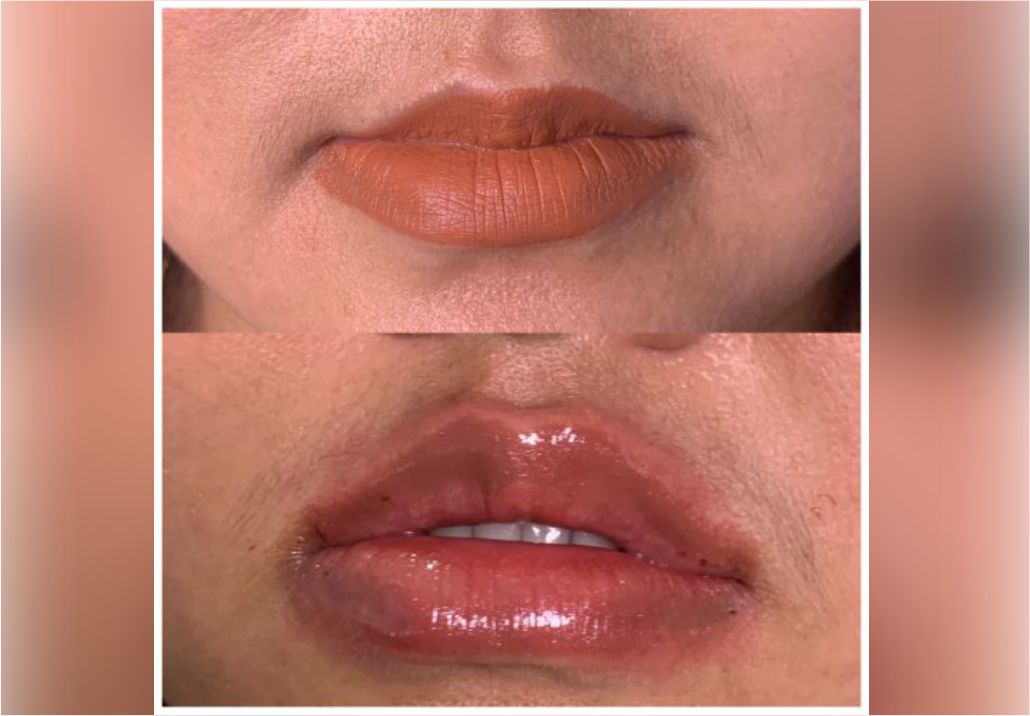 The before-and-after results show naturally plumper, well-defined lips, creating a youthful, confident appearance with immediate visible improvement.